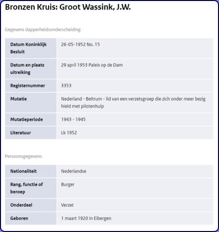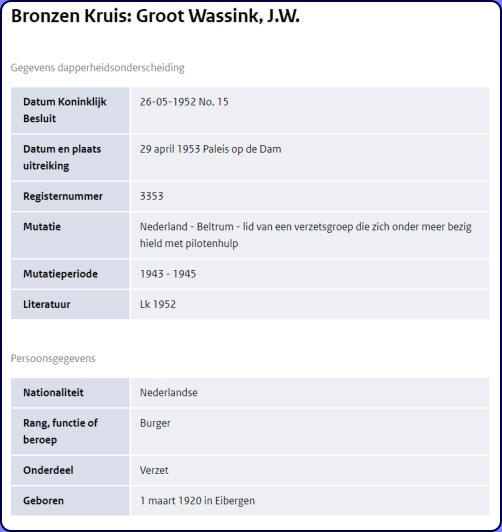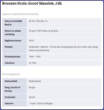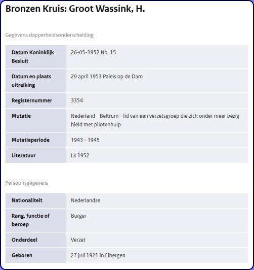 De Broers J.W. Groot Wassink en H. Groot Waasink uit Beltrum hebben als burgers in 1952 een bronzen kruis gekregen wegens lidmaatschap van een