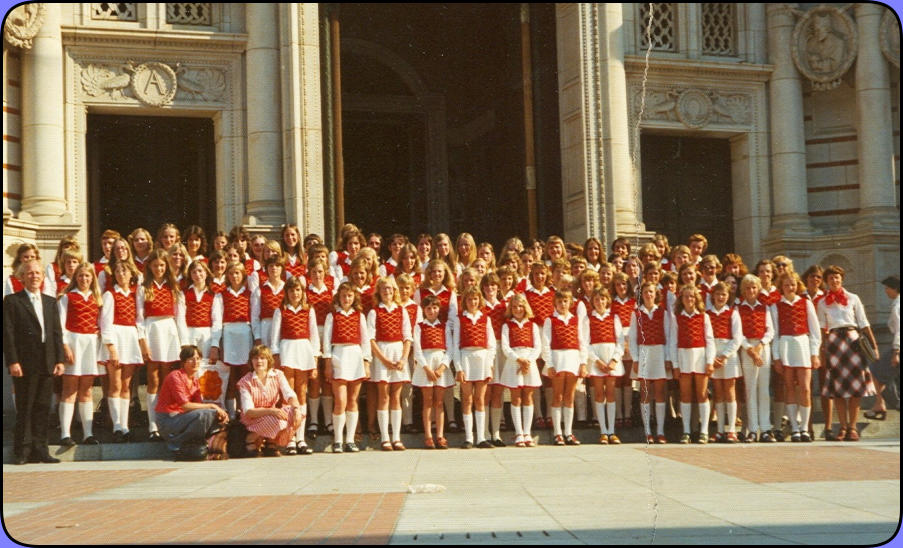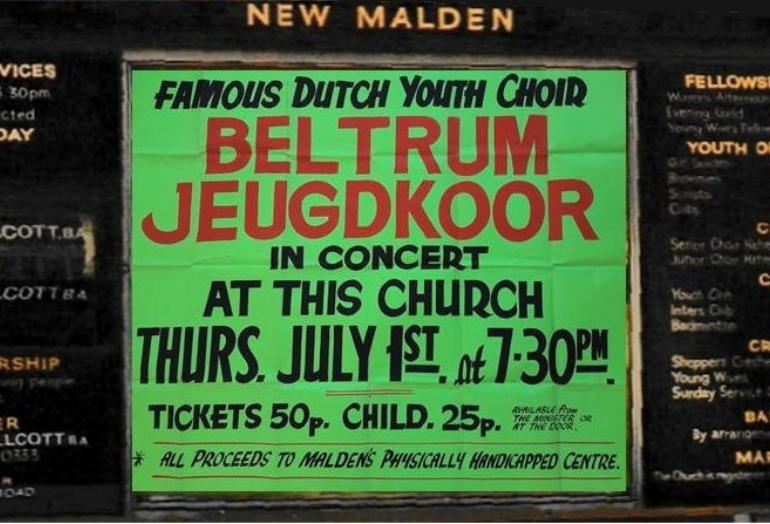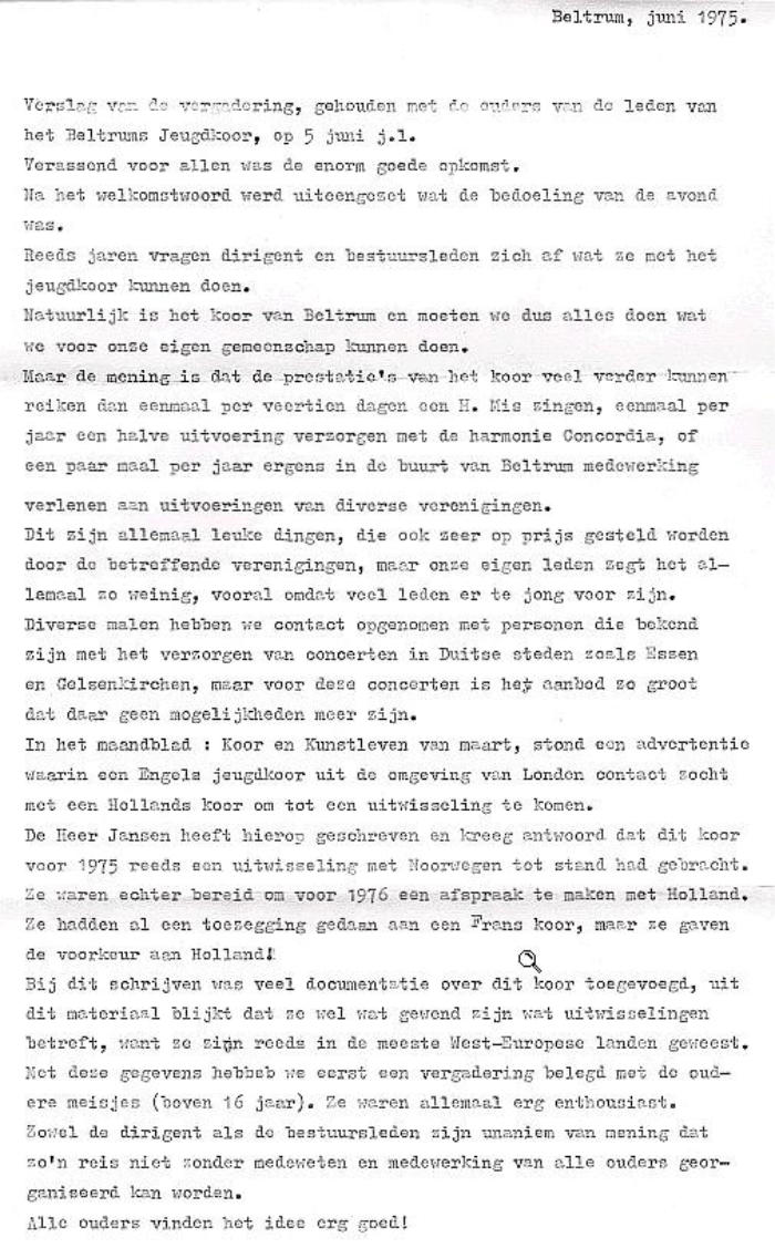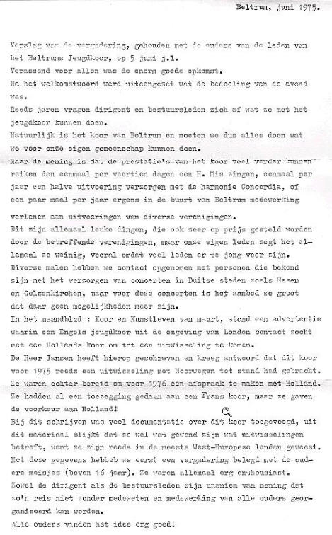 Zanggroep Rhumtas  (voorheen Beltrums jeugdkoor) 1975     1976 - Reis naar Engeland  Jeugdkoor Beltrum oefent intensief voor Britse concertreis Het Beltrums Jeugdkoor met negentig leden een van de grootste jeugdkoren in de Achterhoek oefent de laatste tijd intensief voor de concertreis naar Engeland. Op het uitgebreide repertoire van het koor staan uiteraard nogal wat Nederlandse nummers, want de jeugdige Beltrummers willen in Engeland bewijzen, dat Nederland een zingende natie is. Met 100 man - inclusief begeleiders - wordt de reis naar Engeland gemaakt. Vijftien jaar geleden kwam het Beltrums Jeugdkoor - het was toen nog het Beltrums Kinderkoor - schoorvoetend uit de startblokken. Het hoofd van de Lebuinusschool de heer G. Jansen, bracht op verzoek van de toenmalige Beltrumse pastoor Smit een groepje schoolkinderen bij elkaar om enkele kerstliedjes in te studeren. "Daar kwam wat later een simpel Ave Maria bij", aldus George Jansen. De groep, waarmee begonnen werd, bestond uit 12 kinderen. Na de uitbreiding van het repertoire steeg het ledental snel. Er werd begonnen met meerstemmige missen, terwijl voor de afwisseling ook enkele walsen van Strauss werden gezongen. Collectes Om in financieel opzicht het hoofd boven water te kunnen houden, werden regelmatig "klompcollectes" aan de kerkdeuren gehouden. Later startte de jeugd met oud-papieracties en er kwam een volwaardig bestuur, waardoor uit de gemeentekas van Eibergen een jaarlijkse subsidie verkregen kon worden. Ter versteviging van de onderlinge band maakte het koor samen met de oudpapier-ophalers jaarlijks een uitstapje. Ook werd begonnen met uitwisselingsconcerten. Maar de jeugd raakte wat uitgekeken op de jaarlijkse tripjes. Om de oudere meisjes - het koor telt ook al enkele getrouwde dames - onder de leden eens extra te trakteren, viel vorig jaar het besluit een concertreis naar het buitenland te maken. De keus viel op Engeland. Toen de fancy fair-commissie van Beltrum van deze plannen hoorde, was de ploeg maar al te graag bereid een financiële actie te organiseren om voldoende reisgeld bijeen te krijgen. Al enkele weken is men in Beltrum druk bezig met het voorbereiden van deze fancy fair, die op 17, 18 en 19 juni in de geheel verbouwde zaal van Huinink zal worden gehouden.  Jeugdkoor Beltrum vertrok in alle vroegte naar Engeland. Vlekkeloze eerste etappe Op dinsdag 29 juni 1976 vertrok het gezelschap bestaande uit 97 personen, het koor zelf telde 89 leden, naar Engeland. De Beltrumse bevolking was in grote getale gekomen om het koor uit te zwaaien. Naast de dirigent en vaste pianiste gingen er een reservedirigent en -pianiste mee, twee verpleegsters en dhr. Theo Temmink als fotograaf. Dhr. Hindeloopen ging mee als reisleider. De reis ging per bus naar Vlissingen van waar men met de veerboot de oversteek maakte naar Sheerness. De tocht werd daarna voortgezet naar New Malden. De gastgezinnen deden er alles aan om het de koorleden naar de zin te maken. Het was in menig opzicht wennen. De taal, breakfest met cornflakes, bacon en eggs. De bezienswaardigheden van de City of Londen werden te voet en met de ondergrondse afgelegd. Veel koorleden gingen nu 's avonds juist wel vroeg naar bed, omdat een goed gesprek met hun gastouders maar niet op gang wilde komen. Het meest gebezigde woord was dan ook, Yes, Yes, Yes. Daar er toen nog geen mobieltjes waren konden ongeruste ouders 's avonds dhr. Theo Groot Zevert bellen voor informatie. ,,De eerste etappe zit er op”. Dit hebben wij er al goed afgebracht. Deze opmerking uit de mond van George Jansen, dirigent van het Beltrumse Jeugdkoor, typeert duidelijk de blijdschap over de goede start, toen dinsdagavond vanuit de bussen van Bax uit Groenlo aan de haven in Vlissingen de koffers waren overgeladen en het 90 leden tellende koor veilig aan boord was voor de overtocht naar Engeland. De concertreis van acht dagen was begonnen. De aanloop naar Vlissingen had een vlot verloop. Zonder mankementen werden de eerste tweehonderd kilometers overbrugd. De kerktoren in Beltrum sloeg dinsdagmorgen half vijf, toen de bussen koers zetten in de richting Vlissingen. Aan het instappen was een zenuwachtig half uurtje vooraf gegaan. Vaders en moeders hielpen met koffers te sjouwen en gaven hun kinderen nog een allerlaatste instructie: "Goed oppassen -luisteren naar de leidsters en bi'j den trop blieven”. Vele kinderen leken op makke lammeren. Verschillende hadden vanwege de spanning nauwelijks geslapen. Wekkers liepen veel te vroeg af. Iedereen was vlot op tijd. De jeugd luisterde prompt naar de laatste aanwijzingen van George Jansen, die ondanks het vroege uur al regelmatig het zweet van zijn voorhoofd moest poetsen. Theo Temmink, onderwijzer aan de Ludger-Willibrordschool legde in alle rust de eerste indrukken op de gevoelige filmband vast. Hij liet zijn (geluids)camera ijverig snorren. Het zal best een interessante film worden, want Theo zit tijdens de gehele concertreis het "nieuws" op de hielen. Niet mee. Eén meisje mocht op doktersadvies niet mee. Maar de tienjarige José Elshof presteerde het wel om haar vriendjes en vriendinnetjes uit te wuiven. Zij hield zich kranig. Wat had ze die tocht graag meegemaakt. Silvia te Brinke (10) hoorde wel tot de uitverkorenen. Zij helpt haar broertjes wel eens met de bezorging van De Gelderlander in Beltrum. Dat deed bij de promotor van de Engelandreis de vraag reizen: "Sylvia, hoe moet dat nu met de krant ?" Maar Sylvia was niet uit haar lood geslagen. Gevat antwoordde zij: "Dat geet wal good. Anders möj 'm moar komen halen". Het zijn uitsluitend koorleden, die de sprong over de Noordzee maken. De oudste leden treden als teamleiders op. George Jansen heeft de taken goed verdeeld.  Hierboven de aankondiging van het concert in New Malden in Engeland. De opbrengst van het concert kwam ten goede aan het Centrum voor mensen met een geestelijke beperking.  Vijf concerten Pastoor Brummelhuis deed de jeugd ook uitgeleide. Hij had de overtocht ook wel willen maken, maar vo