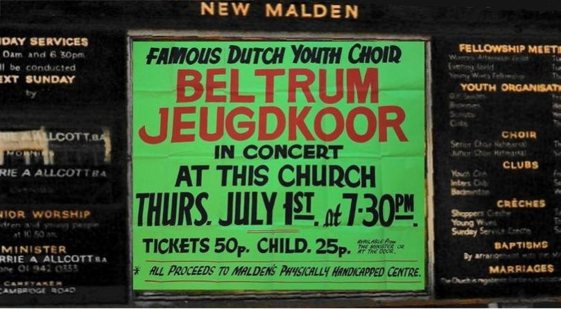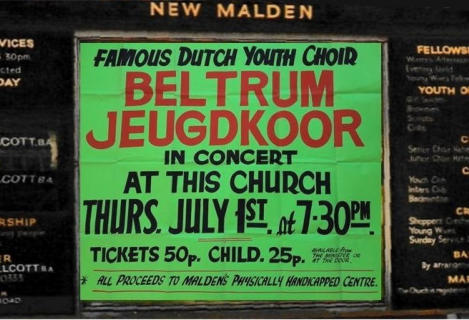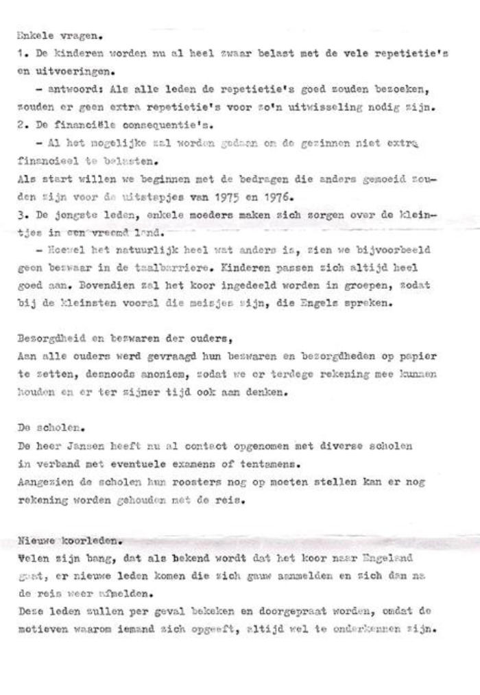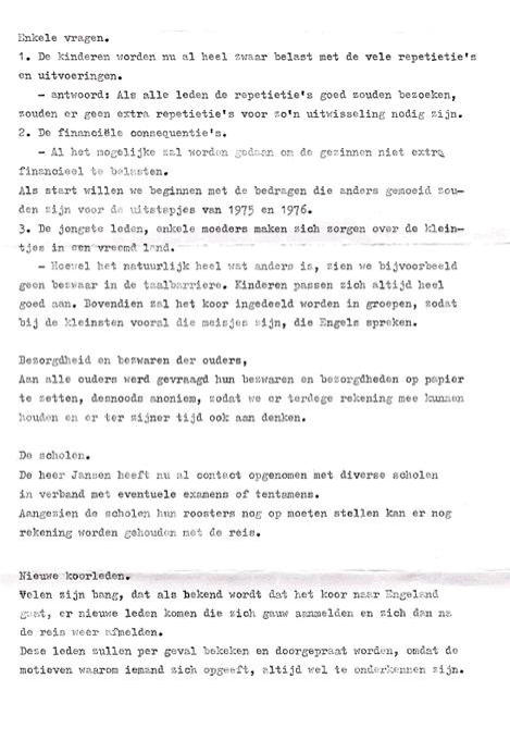 Archief Verenigingen Zanggroep Rhumtas  (voorheen Beltrums jeugdkoor) 1975     1976 - Reis naar Engeland  Jeugdkoor Beltrum oefent intensief voor Britse concertreis Het Beltrums Jeugdkoor met negentig leden een van de grootste jeugdkoren in de Achterhoek oefent de laatste tijd intensief voor de concertreis naar Engeland. Op het uitgebreide repertoire van het koor staan uiteraard nogal wat Nederlandse nummers, want de jeugdige Beltrummers willen in Engeland bewijzen, dat Nederland een zingende natie is. Met 100 man - inclusief begeleiders - wordt de reis naar Engeland gemaakt. Vijftien jaar geleden kwam het Beltrums Jeugdkoor - het was toen nog het Beltrums Kinderkoor - schoorvoetend uit de startblokken. Het hoofd van de Lebuinusschool de heer G. Jansen, bracht op verzoek van de toenmalige Beltrumse pastoor Smit een groepje schoolkinderen bij elkaar om enkele kerstliedjes in te studeren. "Daar kwam wat later een simpel Ave Maria bij", aldus George Jansen. De groep, waarmee begonnen werd, bestond uit 12 kinderen. Na de uitbreiding van het repertoire steeg het ledental snel. Er werd begonnen met meerstemmige missen, terwijl voor de afwisseling ook enkele walsen van Strauss werden gezongen. Collectes Om in financieel opzicht het hoofd boven water te kunnen houden, werden regelmatig "klompcollectes" aan de kerkdeuren gehouden. Later startte de jeugd met oud-papieracties en er kwam een volwaardig bestuur, waardoor uit de gemeentekas van Eibergen een jaarlijkse subsidie verkregen kon worden. Ter versteviging van de onderlinge band maakte het koor samen met de oudpapier-ophalers jaarlijks een uitstapje. Ook werd begonnen met uitwisselingsconcerten. Maar de jeugd raakte wat uitgekeken op de jaarlijkse tripjes. Om de oudere meisjes - het koor telt ook al enkele getrouwde dames - onder de leden eens extra te trakteren, viel vorig jaar het besluit een concertreis naar het buitenland te maken. De keus viel op Engeland. Toen de fancy fair-commissie van Beltrum van deze plannen hoorde, was de ploeg maar al te graag bereid een financiële actie te organiseren om voldoende reisgeld bijeen te krijgen. Al enkele weken is men in Beltrum druk bezig met het voorbereiden van deze fancy fair, die op 17, 18 en 19 juni in de geheel verbouwde zaal van Huinink zal worden gehouden.  Jeugdkoor Beltrum vertrok in alle vroegte naar Engeland. Vlekkeloze eerste etappe Op dinsdag 29 juni 1976 vertrok het gezelschap bestaande uit 97 personen, het koor zelf telde 89 leden, naar Engeland. De Beltrumse bevolking was in grote getale gekomen om het koor uit te zwaaien. Naast de dirigent en vaste pianiste gingen er een reservedirigent en -pianiste mee, twee verpleegsters en dhr. Theo Temmink als fotograaf. Dhr. Hindeloopen ging mee als reisleider. De reis ging per bus naar Vlissingen van waar men met de veerboot de oversteek maakte naar Sheerness. De tocht werd daarna voortgezet naar New Malden. De gastgezinnen deden er alles aan om het de koorleden naar de zin te maken. Het was in menig opzicht wennen. De taal, breakfest met cornflakes, bacon en eggs. De bezienswaardigheden van de City of Londen werden te voet en met de ondergrondse afgelegd. Veel koorleden gingen nu 's avonds juist wel vroeg naar bed, omdat een goed gesprek met hun gastouders maar niet op gang wilde komen. Het meest gebezigde woord was dan ook, Yes, Yes, Yes. Daar er toen nog geen mobieltjes waren konden ongeruste ouders 's avonds dhr. Theo Groot Zevert bellen voor informatie. ,,De eerste etappe zit er op”. Dit hebben wij er al goed afgebracht. Deze opmerking uit de mond van George Jansen, dirigent van het Beltrumse Jeugdkoor, typeert duidelijk de blijdschap over de goede start, toen dinsdagavond vanuit de bussen van Bax uit Groenlo aan de haven in Vlissingen de koffers waren overgeladen en het 90 leden tellende koor veilig aan boord was voor de overtocht naar Engeland. De concertreis van acht dagen was begonnen. De aanloop naar Vlissingen had een vlot verloop. Zonder mankementen werden de eerste tweehonderd kilometers overbrugd. De kerktoren in Beltrum sloeg dinsdagmorgen half vijf, toen de bussen koers zetten in de richting Vlissingen. Aan het instappen was een zenuwachtig half uurtje vooraf gegaan. Vaders en moeders hielpen met koffers te sjouwen en gaven hun kinderen nog een allerlaatste instructie: "Goed oppassen -luisteren naar de leidsters en bi'j den trop blieven”. Vele kinderen leken op makke lammeren. Verschillende hadden vanwege de spanning nauwelijks geslapen. Wekkers liepen veel te vroeg af. Iedereen was vlot op tijd. De jeugd luisterde prompt naar de laatste aanwijzingen van George Jansen, die ondanks het vroege uur al regelmatig het zweet van zijn voorhoofd moest poetsen. Theo Temmink, onderwijzer aan de Ludger-Willibrordschool legde in alle rust de eerste indrukken op de gevoelige filmband vast. Hij liet zijn (geluids)camera ijverig snorren. Het zal best een interessante film worden, want Theo zit tijdens de gehele concertreis het "nieuws" op de hielen. Niet mee. Eén meisje mocht op doktersadvies niet mee. Maar de tienjarige José Elshof presteerde het wel om haar vriendjes en vriendinnetjes uit te wuiven. Zij hield zich kranig. Wat had ze die tocht graag meegemaakt. Silvia te Brinke (10) hoorde wel tot de uitverkorenen. Zij helpt haar broertjes wel eens met de bezorging van De Gelderlander in Beltrum. Dat deed bij de promotor van de Engelandreis de vraag reizen: "Sylvia, hoe moet dat nu met de krant ?" Maar Sylvia was niet uit haar lood geslagen. Gevat antwoordde zij: "Dat geet wal good. Anders möj 'm moar komen halen". Het zijn uitsluitend koorleden, die de sprong over de Noordzee maken. De oudste leden treden als teamleiders op. George Jansen heeft de taken goed verdeeld.  Hierboven de aankondiging van het concert in New Malden in Engeland. De opbrengst van het concert kwam ten goede aan het Centrum voor mensen met een geestelijke beperking.  Vijf concerten Pastoor Brummelhuis deed de jeugd ook uitgeleide. Hij had de overtocht ook wel 
