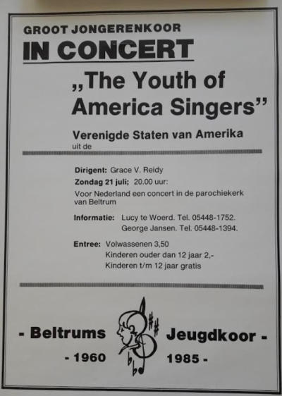 1985 Amerikaans jeugdkoor-The Youth of America Singers-swingend in Beltrum  "Ik denk dat we er bijzonder goed in zijn geslaagd om de belangstellenden die zowel het concert van het Poolse koor Cantus, dat enkele weken geleden in Beltrum was, en de mensen die vanavond dit schitterende concert hebben bijgewoond, een totaal verschillend programma te brengen uit geheel verschillende culturen". Dit vonden George Jansen en Lucy te Woerd-Reuvekamp gisteravond na afloop van het concert dat in de Beltrumse parochiekerk verzorgd werd door bet Amerikaanse koor The Youth of Amerika Singers. George Jansen en Lucy te Woerd namen het initiatief om de beide koren naar Beltrum te halen in het kader van de viering van het 25-jarig bestaan van het Beltrumse jeugd-koor. Beiden hebben onlangs afscheid genomen van dit koor en zij wilden met de organisatie van deze twee concerten hun talloze activiteiten voor het jeugdkoor definitief afsluiten. De Amerikaanse gasten waren zaterdagmiddag al naar Beltrum gekomen, waar ze door de leden van het jeugdkoor, het bestuur, de gastouders en burgemeester Cappetti van Eibergen verwelkomd werden. In de aula van de Ludgerschool werden de Amerikanen toegesproken, terwijl de leden van het jeugdkoor bij wijze van welkomstgroet aan alle zangers en zangeressen een roos aanboden. Zondagmorgen werd de gasten een excursie aangeboden door de klompenfabriek van Paul Nijhuis. Veel belangstelling hadden de koorleden ook voor de molen in Harreveld, die zondagmiddag werd bezocht, evenals de kaasboerderij van de familie Weenink en het museum Erve Kots. Zondagavond waren vele honderden belangstellenden naar de parochiekerk gekomen voor het concert dat The Youth of America Singers verzorgden. Er werd een uitgebreid en correct verzorgd programma gebracht van moderne Amerikaanse liederen en stukken uit de twintiger jaren. "De meerstemmigheid waarmee gezongen werd lijkt wel iets op die in Europa, maar toch komt het bij ons wat vreemd over. Het zijn echter liederen die bijzonder rijk zijn van inhoud", aldus George Jansen. Vooral het swingende en vrolijke karakter van de gebrachte liederen sprak de aanwezigen bijzonder aan. Volgens een van de zangeressen was het verblijf in Beltrum een van de mooiste geweest van de hele concertreis door Europa, die al op 3 juli is begonnen. Vanmorgen is het koor weer uit Beltrum vertrokken naar Hoek van Holland, voor de overtocht naar Engeland. Het koor werd uitgewuifd door de leden van het Beltrumse jeugdkoor en tal van gastouders die allen bijzonder enthousiast waren over het verblijf van de Amerikanen in Beltrum.. Het Betrumse jeugdkoor heeft de feestelijkheden rond de viering van het 25-jarig bestaan met het bezoek van The Youth of America Singers op waardige wijze afgesloten 1959 1967 1975 1977 1981 1984 1985 1999 2009 2015 2019 1989 Concertreis Luxemburg 1995 Dülmen Duitsland  Historische mooie Duitse ‘’lofzang’’ over het optreden van het Beltrums jeugkoor in Dülmen Duitsland Musik-Gala wurde genussvolles Erlebnis. Leistungen der Spitzenklasse wurden geboten. Es war wieder einmal ein musikalisch herausragendes Erlebnis: Das 16 Weihnachtskonzert, das die Stadtkapelle in Zusammenarbeit mit dem Verkehrs- und Heimatverein der Tiberstadt veranstaltete und das am Samstag und Sonntag zusammen rund 500 Zuhörer in die Aula am Schulzentrum lockte. Und was diese traditionelle musikalische Weihnachts-Gala in diesem Jahr zurn besonders genussvollen Eriebnis werden liess, war neben dem hervorragenden Auftritt des Stadtkapellen-Orchesters unter Leitung von Dieter Hans ein glanzvoller Chor. Der Jugendchor aus Beltrum/Holland unter Leitung von Hans Kienhuis und Klavierbegleitung von Annie Ribbers-Stoverink erwies sich als Klangkörper von aussergewöhnicher Klasse. Die rund 50 Mädchen und Jungen aus der Nähe von Winterswijk bestachen das begeisterte Dülmener Publikum durch aussgerwöhnliche Homogenität und fast professionelle musikalische Disziplin. Mit ihrer internationalen Erfahrung lieferten die jungen Sängerinnen und Sänger aus den Niederlanden eine Vorstellung die fast perfekt und trotzdem lebendig und aufregend zugleich, die kurzum ein absoluter Glanzpunkt war. Mit welcher Hingabe das sensible Gospel "My Lord what a morning ''interpretiert wurde, mit welchem Feingefühl die Tom-Jones-Ballade ''Try to remember" das Publikum ërreichte -das alles war überaus gekonnt. Neben dem bekannten ''Bridge over troubeled water'' und dem locker swingenden ''Baby face" war sicherlich "Stay with me'' nach einer Mozart-Melodie, dargeboten als lyrisch-romantische Phantasie, ein Höhepunkt des Abends, der durch zwei Nederländische Weihnachtslieder abgerundert wurde, die den Friedensgedanken in den Mittelpunkt rückten. Den Auftakt machte jedoch die Stadskapelle mit dem feurugen Militarmarch nr. 1 op. 51 von Frans Schubert es folgte ein 'Besuch'' bei Karl Millocker, dem bekannten Operrette-Kompnisten: Melodien aus ''Gasparone'' sowie der Betelstüdent'' erfreuten das Publikum. Johann Straus-Walzer erzählten Geschichten aus dem Wienerwald und ein James-Bond-Medley erinnerte musikalisch vortrefflich aufbereitet an "Goldinger' und andere 007-Filme.