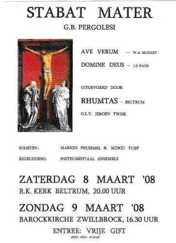1999 Rhumtas : 40 jaar een begrip in Beltrum  Een modern koor met trouwe leden dat zowel hedendaagse als klassieke liederen zingt en altijd kan rekenen op steun van de Beltrumse bevolking. Zo kijkt het bestuur van zangvereniging Rhumtas terug op de veertig jaar dat het koor nu bestaat. Al die veertig jaar zingt Rhumtas in de parochiekerk waar de zangvereniging, toen nog Beltrums kinderkoor genoemd, de eerste gezangen liet horen. Na 'kinderkoor' kreeg de vereniging de naam 'jeugdkoor' en sinds een jaar of tien staat het bekend als zangvereniging Rhumtas. Dit om aan te geven dat alle leeftijdsgroepen welkom zijn. Ter ere van het jubileum is er op zondag 20 juni een concert in het park samen met het Beltrums mannenkoor dat tien jaar bestaat. Later in het jaar, op zaterdag 25 September, is er een jubileumviering in de kerk en op 1, 2 en 3 ok tober wordt een verrassingsweekend gehouden voor de leden. Met een kerstconcert op 19 december worden de feestelijkheden afgesloten. Annie Ribbers-Stoverink is vanaf het begin al pianiste en organiste. Zij heeft dan ook alle ups en downs van het koor meegemaakt. ,,Dat de Beltrumers het koor door dik en dun steunen, heeft als prettig gevolg dat de contributie laag kan worden gehouden. Daarnaast is ook de zelfwerkzaamheid van de leden groot, ook na 40 jaar wordt nog steeds een keer in de drie weken een viering in de kerk verzorgd." George Jansen, voormalig schoolhoofd in Beltrum, is de grondlegger van het koor. Ook was hij vele jaren dirigent. Bij het 25-jarig bestaan werd Jansen benoemd tot eredirigent. Korte tijd later gaf hij de dirigeerstok over aan Emiel Engel, die op zijn beurt opgevolgd werd door Hans Kienhuis en Cristo Iliev Sinds 1993 zwaait Bart Blaak de scepter bij de zangvereniging die momenteel 24 leden telt. Dankzij de opbrengst van een fancy fair kon in 1976 door alle koorleden een reis gemaakt worden naar Engeland. ,,Toen we terugkwamen stond half Beltrum ons op te wachten. De klokken luidden en dat heeft grote indruk op ons gemaakt." Het koor kende ooit tachtig leden waardoor destijds een ledenstop ingevoerd moest worden. Dat er nu heel wat minder zijn, komt volgens Wolterink doordat veel jongeren niet meer thuis wonen. Ook het feit dat Beltrum veel verenigingen kent, heeft hier waarschijnlijk mee te maken. Bovendien is het aantal koren in het dorp uitgebreid, al blijft Rhumtas nog steeds een begrip in Beltrum.  Oorkonde behorende bij de eremedaille in goud v.d. Nederlandse Sint-Gregoriusvereniging, toegekend aan Annie Ribbers-Stoverink, die zich gedurende 40 jaar heeft ingezet voor de kerkmuziek. 1959 1967 1975 1977 1981 1984 1985 1999 2009 2015 2019 2003 2006 2008 Het vrouwenkoor Rhumtas uit Beltrum geeft het komend weekend twee uitvoeringen. Over het algemeen voert het koor, dat onder leiding van de Henge-lose dirigent Jeroen Twisk staat, lichte muziek uit. Zaterdag en zondag staat onder meer het Stabat Mater van Pergolesi op het programma.  'Stabat mater dolorosa Luxta crucem lacrimosa Duin pendebat filius'. Dit zijn de eerste regels van het uit de middeleeuwen overgeleverde gedicht 'Stabat mater dolorosa', dat het verdriet van Maria belicht bij het lijden van haar gekruisigde zoon, Jezus Christus. Meerdere componisten lieten zich door de tekst inspireren en zetten het op muziek. Een van de bekendste is wel het Stabat Mater van Pergolesi. Komende zaterdag en zondag heeft het vrouwenkoor Rhumtas uit Beltrum het stuk ook op het programma. Jeroen Twisk, sinds zes jaar de vaste dirigent van het koor, verklaart dat Rhumtas er bij uitstek de stern-kwaliteiten voor heeft. "Van origine is Rhumtas een popkoor", aldus de dirigent. "Het is 49 jaar geleden ontstaan uit een kinderkoor dat van de oorspronkelijk dirigent 'een stevige basis heeft meegekregen. Toen ik ze voor het eerst hoorde zingen was ik onder de indruk van de power van deze dames. Het enige dat nog hoefde te gebeuren, was enig polijstwerk om een 'rondere' klank te krijgen. Inmiddels heeft de klank van Rhumtas een zodanige kwaliteit, dat het me de moeite waard leek om ook eens iets klassieks op het programma te zetten." Drie jaar geleden had Rhumtas, samen met een ander koor, The Young Messiah van Handel al eens op het repertoire. De vraag of het de bedoeling is dat het vrouwenkoor op den duur een definitieve overstap maakt van pop- naar klassieke muziek, beantwoordt Twisk ontkennend. "De reden dat ik de dames eens in de drie jaar klassieke muziek laat uitvoeren, is om ze een mooie herinnering voor later mee te geven, zodat ze terug kunnen kijken op een bijzonder concert. In principe blijft het een koor dat affiniteit heeft met lichte muziek maar de stemmogelijkheden worden zoveel beter uitgediept in de klassieke dan in de popmuziek: de lange, melodieuze lijnen bieden veel meer mogelijkheden. Dit koor kan het aan, dus dan is het zonde om het te laten liggen". Naast het Stabat Mater staan ook een bewerking voor vrouwenkoor van het Ave Verum van Mozart en een duet uit de Mis in G van Bach op het programma. Het duet wordt gezongen door de solisten Marion Frummel (sopraan) en Minou Tuijp (alt). Zaterdag vindt het concert van Rhumtas plaats in de R.K. Kerk te Beltrum. De aanvang is om 20.00 uur. Zondag is er een uitvoering in de St. Franciscus Barokkerk te Zwill-brock (Dld), aanvang 16.30 uur. De entree is gratis. Een vrije gift wordt op prijs gesteld.