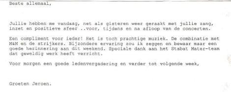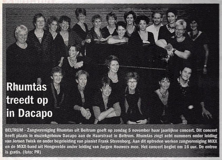Zanggroep Rhumtas  (voorheen Beltrums jeugdkoor) 1999 Rhumtas : 40 jaar een begrip in Beltrum  Een modern koor met trouwe leden dat zowel hedendaagse als klassieke liederen zingt en altijd kan rekenen op steun van de Beltrumse bevolking. Zo kijkt het bestuur van zangvereniging Rhumtas terug op de veertig jaar dat het koor nu bestaat. Al die veertig jaar zingt Rhumtas in de parochiekerk waar de zangvereniging, toen nog Beltrums kinderkoor genoemd, de eerste gezangen liet horen. Na 'kinderkoor' kreeg de vereniging de naam 'jeugdkoor' en sinds een jaar of tien staat het bekend als zangvereniging Rhumtas. Dit om aan te geven dat alle leeftijdsgroepen welkom zijn. Ter ere van het jubileum is er op zondag 20 juni een concert in het park samen met het Beltrums mannenkoor dat tien jaar bestaat. Later in het jaar, op zaterdag 25 September, is er een jubileumviering in de kerk en op 1, 2 en 3 ok tober wordt een verrassingsweekend gehouden voor de leden. Met een kerstconcert op 19 december worden de feestelijkheden afgesloten. Annie Ribbers-Stoverink is vanaf het begin al pianiste en organiste. Zij heeft dan ook alle ups en downs van het koor meegemaakt. ,,Dat de Beltrumers het koor door dik en dun steunen, heeft als prettig gevolg dat de contributie laag kan worden gehouden. Daarnaast is ook de zelfwerkzaamheid van de leden groot, ook na 40 jaar wordt nog steeds een keer in de drie weken een viering in de kerk verzorgd." George Jansen, voormalig schoolhoofd in Beltrum, is de grondlegger van het koor. Ook was hij vele jaren dirigent. Bij het 25-jarig bestaan werd Jansen benoemd tot eredirigent. Korte tijd later gaf hij de dirigeerstok over aan Emiel Engel, die op zijn beurt opgevolgd werd door Hans Kienhuis en Cristo Iliev Sinds 1993 zwaait Bart Blaak de scepter bij de zangvereniging die momenteel 24 leden telt. Dankzij de opbrengst van een fancy fair kon in 1976 door alle koorleden een reis gemaakt worden naar Engeland. ,,Toen we terugkwamen stond half Beltrum ons op te wachten. De klokken luidden en dat heeft grote indruk op ons gemaakt." Het koor kende ooit tachtig leden waardoor destijds een ledenstop ingevoerd moest worden. Dat er nu heel wat minder zijn, komt volgens Wolterink doordat veel jongeren niet meer thuis wonen. Ook het feit dat Beltrum veel verenigingen kent, heeft hier waarschijnlijk mee te maken. Bovendien is het aantal koren in het dorp uitgebreid, al blijft Rhumtas nog steeds een begrip in Beltrum.  Oorkonde behorende bij de eremedaille in goud v.d. Nederlandse Sint-Gregoriusvereniging, toegekend aan Annie Ribbers-Stoverink, die zich gedurende 40 jaar heeft ingezet voor de kerkmuziek. 1959 1967 1975 1977 1981 1984 1985 1999 2009 2015 2019 Het vrouwenkoor Rhumtas uit Beltrum geeft het komend weekend twee uitvoeringen. Over het algemeen voert het koor, dat onder leiding van de Henge-lose dirigent Jeroen Twisk staat, lichte muziek uit. Zaterdag en zondag staat onder meer het Stabat Mater van Pergolesi op het programma.  'Stabat mater dolorosa Luxta crucem lacrimosa Duin pendebat filius'. Dit zijn de eerste regels van het uit de middeleeuwen overgeleverde gedicht 'Stabat mater dolorosa', dat het verdriet van Maria belicht bij het lijden van haar gekruisigde zoon, Jezus Christus. Meerdere componisten lieten zich door de tekst inspireren en zetten het op muziek. Een van de bekendste is wel het Stabat Mater van Pergolesi. Komende zaterdag en zondag heeft het vrouwenkoor Rhumtas uit Beltrum het stuk ook op het programma. Jeroen Twisk, sinds zes jaar de vaste dirigent van het koor, verklaart dat Rhumtas er bij uitstek de stern-kwaliteiten voor heeft. "Van origine is Rhumtas een popkoor", aldus de dirigent. "Het is 49 jaar geleden ontstaan uit een kinderkoor dat van de oorspronkelijk dirigent 'een stevige basis heeft meegekregen. Toen ik ze voor het eerst hoorde zingen was ik onder de indruk van de power van deze dames. Het enige dat nog hoefde te gebeuren, was enig polijstwerk om een 'rondere' klank te krijgen. Inmiddels heeft de klank van Rhumtas een zodanige kwaliteit, dat het me de moeite waard leek om ook eens iets klassieks op het programma te zetten." Drie jaar geleden had Rhumtas, samen met een ander koor, The Young Messiah van Handel al eens op het repertoire. De vraag of het de bedoeling is dat het vrouwenkoor op den duur een definitieve overstap maakt van pop- naar klassieke muziek, beantwoordt Twisk ontkennend. "De reden dat ik de dames eens in de drie jaar klassieke muziek laat uitvoeren, is om ze een mooie herinnering voor later mee te geven, zodat ze terug kunnen kijken op een bijzonder concert. In principe blijft het een koor dat affiniteit heeft met lichte muziek maar de stemmogelijkheden worden zoveel beter uitgediept in de klassieke dan in de popmuziek: de lange, melodieuze lijnen bieden veel meer mogelijkheden. Dit koor kan het aan, dus dan is het zonde om het te laten liggen". Naast het Stabat Mater staan ook een bewerking voor vrouwenkoor van het Ave Verum van Mozart en een duet uit de Mis in G van Bach op het programma. Het duet wordt gezongen door de solisten Marion Frummel (sopraan) en Minou Tuijp (alt). Zaterdag vindt het concert van Rhumtas plaats in de R.K. Kerk te Beltrum. De aanvang is om 20.00 uur. Zondag is er een uitvoering in de St. Franciscus Barokkerk te Zwill-brock (Dld), aanvang 16.30 uur. De entree is gratis. Een vrije gift wordt op prijs gesteld. 2003 Young People’s Messiah van George Frideric Handel 2006 2008 De koorleden van Rhumtas druk aan het oefenen voor het jubileumconcert dat ze aanstaande zondag in het park van Beltrum geven. Door Harrie Dute Foto: Henk Westerveld