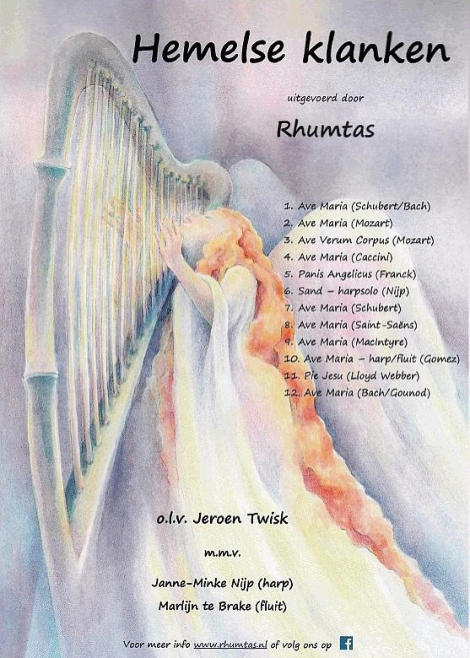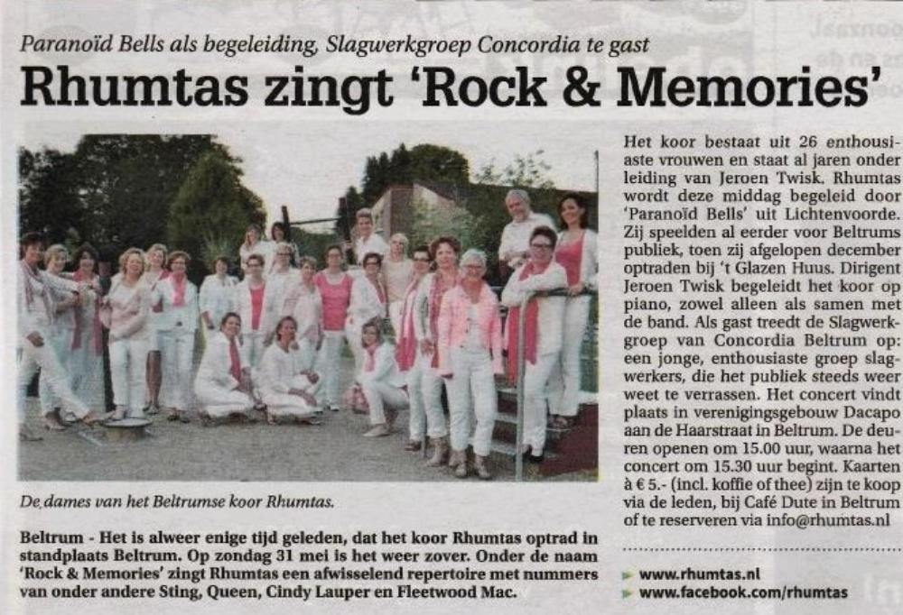 2015  Op zondagmiddag 31 mei 2015 treedt Rhumtas weer eens op voor eigen publiek. De deuren van Dacapo, aan de Haarstraat in Beltrum, openen om 15.00 uur. Iedereen wordt verwelkomd met een kop koffie, thee of een andere consumptie (bij entree inbegrepen), waarna om 15.30 uur het concert begint. We hebben er dit keer voor gekozen om niet alleen a capella of met pianobegeleiding te zingen, maar zullen worden begeleid door de band ‘Paranoïd Bells’ uit Lichtenvoorde. Misschien bij enkelen al bekend van hun optreden bij het ‘Glazen Huus’ in Beltrum afgelopen jaar. Onze dirigent, Jeroen Twisk zal hierbij de pianopartij voor zijn rekening nemen. Het repertoire is natuurlijk op de begeleiding aangepast: afwisselend langzame en snelle popnummers, die zowel bij het koor als de bezoekers menig herinnering naar boven zullen halen. Als gast treedt Slagwerkgroep Concordia op; een jonge, enthousiaste groep slagwerkers, die het publiek steeds weer weet te verrassen.    2016 Der Frauenchor Rhumtas in Konzert. ''Ave Maria'' in acht Variationen gesungen. Zwillbrock 26 mitglieder des frauenchors Rhumtas aus Beltrum/nl haben am sontagnachmittag das geistliche Konzert mit dem Thema ''Hemelse klanken'' -''Himmlische Klänge''- in der Barockkirche Zwillbrock unter der Leiting von Jeroen Twist gestaltet. Unterstürst würde der Chor van Janne-Minke Nijp auf der Harfe und mit Marlijn te Brake auf der Flöte. Mit sicheren stimmen wurden die einzelnen Musikstücke vorgetragen. Das programm bot unter anderem acht Ave Maria von unterschiedlichen Komponisten, passend zum eben beendeten Maimonat. Wie vor 365 jaren die vorfahren uber die Grenze zum Mitternachtsgottesdienst gekommen waren, so kamen auch die Beltrummer Frauen uber die Grenze, um dieses Konzert in der Barockkirche zu gestalten. ''Ein schones Zeigen der Verbundenheit mit Zwillbrock'' sagte Kasstellan Bruder Hubert Müller. Der Chor wurde von vielen Landsleuten begleitet, zu sammen mit der übrigen Zuhörern gab es am Ende trostenden Beifal, der mit einer zugabe belohnt würde. Der Chor bedankte sich bei den Konzertbesuchern mit einem kleine Teelicht, das jeder beim Ausgang überreicht bekam.   2017  Friends in Music  Op zondag 25 juni was het dan zover: ons minifestival ‘Friends in Music’. Vrijdag 9 juni kon een deel van Beltrum al even kennis maken met het Kidsgear Children’s Choir uit Oeganda, binnenkort bij Rhumtas te gast op het festivalconcert ‘Friends in Music’. Vrijdag ging het koor op bezoek bij basisschool ‘De Sterrenboog’, waar ze enkele workshops gaven aan de leerlingen. Er werd geluncht in De Hassinkhof, en natuurlijk werd op beide locaties ook een spetterend optreden verzorgd. Op zaterdag de 24e en de zondagmorgen, was het plein voor Dacapo al opgeruimd en aangekleed tot een klein maar gezellig festivalterrein. De ingang was via het schoolplein van de voormalige Jenaplanschool Het Tweespan. Hier konden de bezoekers ook gebruik maken van het toilet. De weergoden waren ons goed gezind, want het was stralend weer. Veel bezoekers kwamen dan ook met de fiets of wandelend kijken naar de gezellige tentjes met allerlei Afrikaanse artikelen en kunst. De aanwezige kinderen konden Afrikaanse vlechtjes in hun haren laten zetten. En natuurlijk was ook de inwendige mens niet vergeten: heerlijke smoothies, Afrikaanse lekkernijen, waaronder een soort gevuld pannenkoekje en vers gezette Oegandese koffie.  2018  Paradiso, wie wil er nou niet optreden in deze poptempel. Afgelopen zondag 14 januari was het voor ons koor zover. We waren ingeloot om mee te doen met de jaarlijkse Paradiso Korendagen. Op deze 32e editie van de korendagen traden op zaterdag en zondag circa 140 koren uit het hele land op. Amateurzangers en zangeressen van alle leeftijden kwamen naar Paradiso om te laten horen dat zingen hun passie is. Het repertoire was zeer divers, van swingende popnummers tot renaissance muziek en van wereldmuziek tot jazz. Alle koren kregen 15 minuten voor hun optreden. ’s Ochtends vroeg zijn we met de bus naar Amsterdam gereden. Lekker relaxed met koffie en thee erbij. Bij aankomst in Paradiso hadden we nog ruim tijd om naar de optredens van andere koren te gaan luisteren. En om 16.15 uur was het onze beurt. Super spannend natuurlijk, maar met een paar extra repetities stonden we zelfverzekerd op het podium. We hadden gekozen voor de nummers Psalm (Frode Fjellheim), Nothing Else Matters (Metallica), Oceaan (Blof) en True Colors van Cindy Lauper. Het optreden, met onze dirigent Jeroen Twisk achter de piano, ging super goed en het publiek was heel enthousiast. We hebben allemaal genoten van het optreden, maar wat gingen die 15 minuten snel!   2019 1959 1967 1975 1977 1981 1984 1985 1999 2009 2015 2019 Rhumtas bestaat uit 26 enthousiaste vrouwelijke leden. Het repertoire is zeer afwisselend: van voornamelijk populair tot klassiek. De thuishaven is Beltrum, maar de leden komen naast Beltrum uit verschillende plaatsen rondom dit dorp. Momenteel staat het koor onder de bezielende leiding van de muzikale dirigent/pianist Jeroen Twisk. Hij is de 7e dirigent in de geschiedenis van het koor. Dirigenten 1. George Jansen (1959-1985) 2. Emiel Engel (1985-) 6. Martha Bruyn (-2002) 4. Christo Iliev 3. Hans Kienhuis 5. Bart Blaak 7. Jeroen Twisk (2002-heden)
