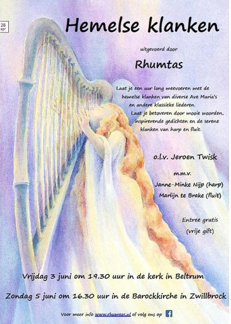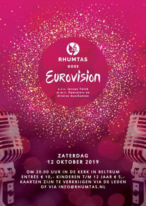 Zanggroep Rhumtas  (voorheen Beltrums jeugdkoor) 2015  Op zondagmiddag 31 mei 2015 treedt Rhumtas weer eens op voor eigen publiek. De deuren van Dacapo, aan de Haarstraat in Beltrum, openen om 15.00 uur. Iedereen wordt verwelkomd met een kop koffie, thee of een andere consumptie (bij entree inbegrepen), waarna om 15.30 uur het concert begint. We hebben er dit keer voor gekozen om niet alleen a capella of met pianobegeleiding te zingen, maar zullen worden begeleid door de band ‘Paranoïd Bells’ uit Lichtenvoorde. Misschien bij enkelen al bekend van hun optreden bij het ‘Glazen Huus’ in Beltrum afgelopen jaar. Onze dirigent, Jeroen Twisk zal hierbij de pianopartij voor zijn rekening nemen. Het repertoire is natuurlijk op de begeleiding aangepast: afwisselend langzame en snelle popnummers, die zowel bij het koor als de bezoekers menig herinnering naar boven zullen halen. Als gast treedt Slagwerkgroep Concordia op; een jonge, enthousiaste groep slagwerkers, die het publiek steeds weer weet te verrassen.    2016 Der Frauenchor Rhumtas in Konzert. ''Ave Maria'' in acht Variationen gesungen. Zwillbrock 26 mitglieder des frauenchors Rhumtas aus Beltrum/nl haben am sontagnachmittag das geistliche Konzert mit dem Thema ''Hemelse klanken'' -''Himmlische Klänge''- in der Barockkirche Zwillbrock unter der Leiting von Jeroen Twist gestaltet. Unterstürst würde der Chor van Janne-Minke Nijp auf der Harfe und mit Marlijn te Brake auf der Flöte. Mit sicheren stimmen wurden die einzelnen Musikstücke vorgetragen. Das programm bot unter anderem acht Ave Maria von unterschiedlichen Komponisten, passend zum eben beendeten Maimonat. Wie vor 365 jaren die vorfahren uber die Grenze zum Mitternachtsgottesdienst gekommen waren, so kamen auch die Beltrummer Frauen uber die Grenze, um dieses Konzert in der Barockkirche zu gestalten. ''Ein schones Zeigen der Verbundenheit mit Zwillbrock'' sagte Kasstellan Bruder Hubert Müller. Der Chor wurde von vielen Landsleuten begleitet, zu sammen mit der übrigen Zuhörern gab es am Ende trostenden Beifal, der mit einer zugabe belohnt würde. Der Chor bedankte sich bei den Konzertbesuchern mit einem kleine Teelicht, das jeder beim Ausgang überreicht bekam.   2017  Friends in Music  Op zondag 25 juni was het dan zover: ons minifestival ‘Friends in Music’. Vrijdag 9 juni kon een deel van Beltrum al even kennis maken met het Kidsgear Children’s Choir uit Oeganda, binnenkort bij Rhumtas te gast op het festivalconcert ‘Friends in Music’. Vrijdag ging het koor op bezoek bij basisschool ‘De Sterrenboog’, waar ze enkele workshops gaven aan de leerlingen. Er werd geluncht in De Hassinkhof, en natuurlijk werd op beide locaties ook een spetterend optreden verzorgd. Op zaterdag de 24e en de zondagmorgen, was het plein voor Dacapo al opgeruimd en aangekleed tot een klein maar gezellig festivalterrein. De ingang was via het schoolplein van de voormalige Jenaplanschool Het Tweespan. Hier konden de bezoekers ook gebruik maken van het toilet. De weergoden waren ons goed gezind, want het was stralend weer. Veel bezoekers kwamen dan ook met de fiets of wandelend kijken naar de gezellige tentjes met allerlei Afrikaanse artikelen en kunst. De aanwezige kinderen konden Afrikaanse vlechtjes in hun haren laten zetten. En natuurlijk was ook de inwendige mens niet vergeten: heerlijke smoothies, Afrikaanse lekkernijen, waaronder een soort gevuld pannenkoekje en vers gezette Oegandese koffie.  2018  Paradiso, wie wil er nou niet optreden in deze poptempel. Afgelopen zondag 14 januari was het voor ons koor zover. We waren ingeloot om mee te doen met de jaarlijkse Paradiso Korendagen. Op deze 32e editie van de korendagen traden op zaterdag en zondag circa 140 koren uit het hele land op. Amateurzangers en zangeressen van alle leeftijden kwamen naar Paradiso om te laten horen dat zingen hun passie is. Het repertoire was zeer divers, van swingende popnummers tot renaissance muziek en van wereldmuziek tot jazz. Alle koren kregen 15 minuten voor hun optreden. ’s Ochtends vroeg zijn we met de bus naar Amsterdam gereden. Lekker relaxed met koffie en thee erbij. Bij aankomst in Paradiso hadden we nog ruim tijd om naar de optredens van andere koren te gaan luisteren. En om 16.15 uur was het onze beurt. Super spannend natuurlijk, maar met een paar extra repetities stonden we zelfverzekerd op het podium. We hadden gekozen voor de nummers Psalm (Frode Fjellheim), Nothing Else Matters (Metallica), Oceaan (Blof) en True Colors van Cindy Lauper. Het optreden, met onze dirigent Jeroen Twisk achter de piano, ging super goed en het publiek was heel enthousiast. We hebben allemaal genoten van het optreden, maar wat gingen die 15 minuten snel!   2019 1959 1967 1975 1977 1981 1984 1985 1999 2009 2015 2019 Rhumtas bestaat uit 26 enthousiaste vrouwelijke leden. Het repertoire is zeer afwisselend: van voornamelijk populair tot klassiek. De thuishaven is Beltrum, maar de leden komen naast Beltrum uit verschillende plaatsen rondom dit dorp. Momenteel staat het koor onder de bezielende leiding van de muzikale dirigent/pianist Jeroen Twisk. Hij is de 7e dirigent in de geschiedenis van het koor. Dirigenten 1. George Jansen (1959-1985) 2. Emiel Engel (1985-) 6. Martha Bruyn (-2002) 4. Christo Iliev 3. Hans Kienhuis 5. Bart Blaak 7. Jeroen Twisk (2002-heden)